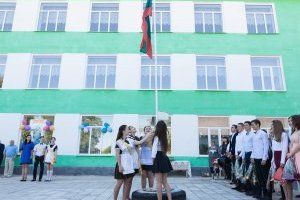 Под звуки гимна ПМР в небо взмывает красно-зеленое полотнище государственного флага. Поднимают его участники районных и республиканских предметных олимпиад.