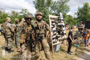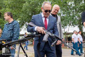 Недалеко от места импровизированного боя были развернуты выставки оружия, современных и ретроавтомобилей, военной техники, полевая кухня, пневматический тир. Осмотрел выставочные павильоны под открытым небом и Председатель Верховного Совета ПМР Александр Коршунов.
