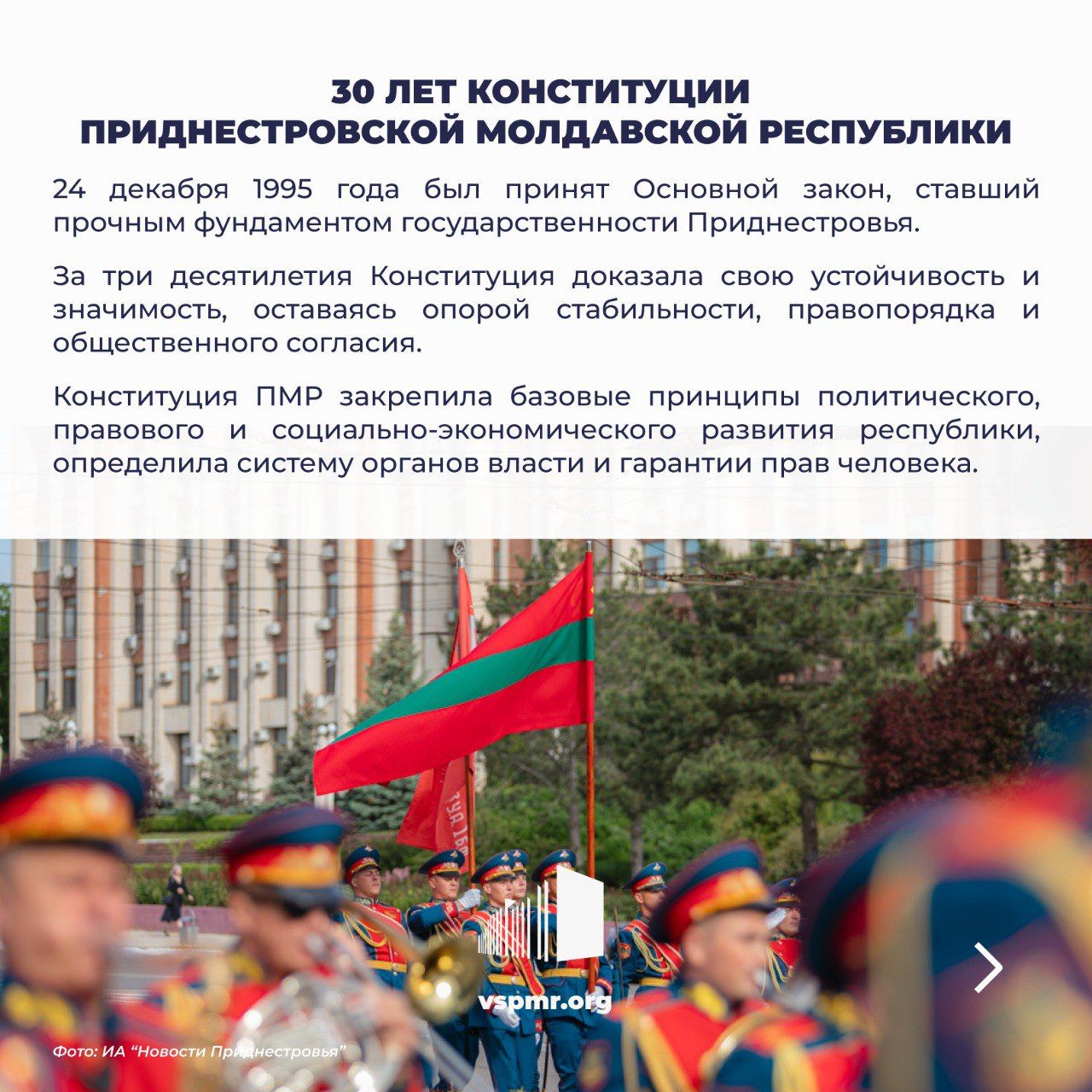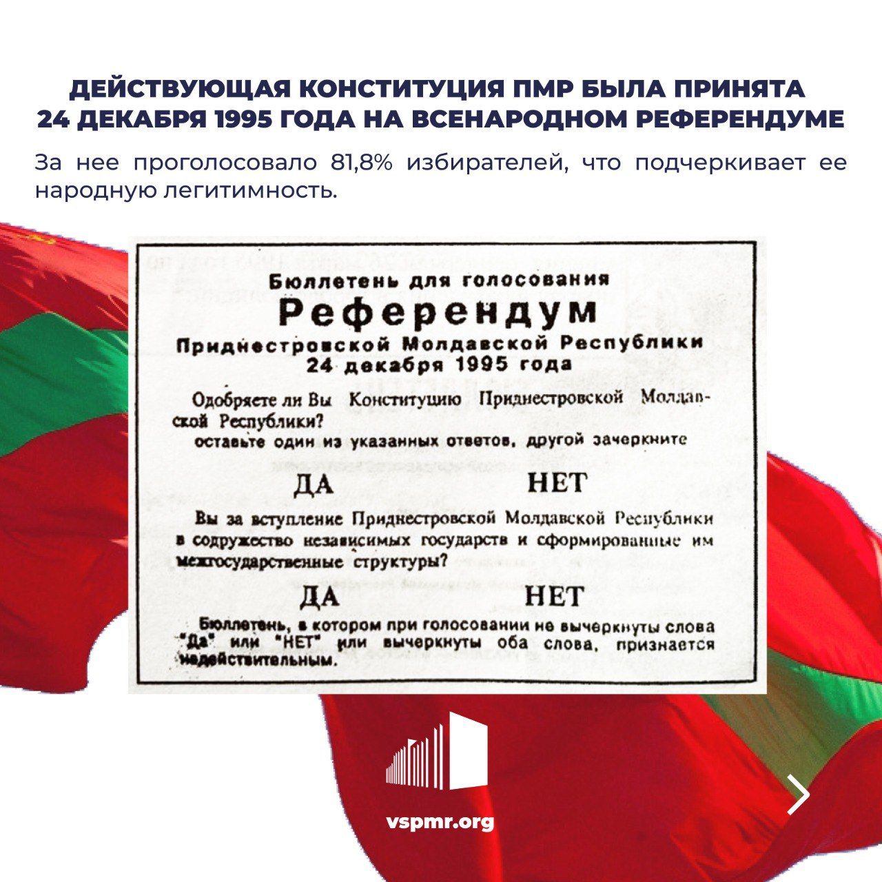 24 декабря 1995 года на всенародном референдуме была принята Конституция ПМР – Основной закон государства, закрепивший принципы государственного устройства, систему органов власти, права и свободы граждан. В карточках парламентской пресс-службы – о ключевых положениях Конституции и ее значении для развития приднестровской государственности.