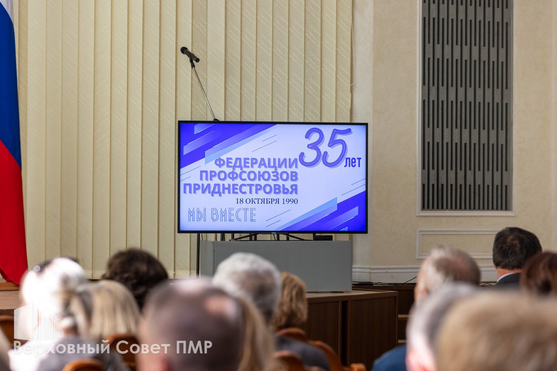 Во Дворце Республики состоялось торжественное собрание, посвященное 35-летию со дня образования Федерации профсоюзов Приднестровья – одной из самых массовых и социально значимых общественных организаций республики, которая сегодня объединяет более 40 000 трудящихся.