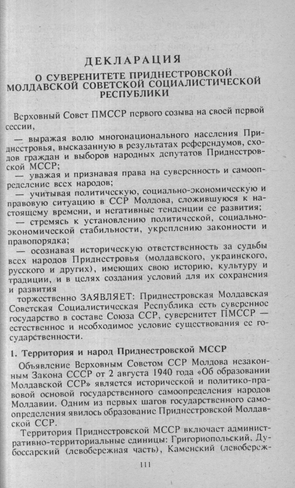 Приднестровская Молдавская Советская Социалистическая Республика есть суверенное государство в составе Союза ССР, суверенитет ПМССР – естественное и необходимое условие существования ее государственности».