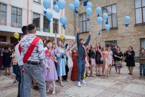 После вручения документов об окончании школы выпускники на сцене исполнили прощальный вальс. Затем вышли на улицу и выпустили в небо белые шары с синей птицей и загадали желания. Синяя птица, как символ путеводной звезды. Она приносит счастье. Для выпускников – это мечта и вера в чудо, символ хорошего и светлого будущего.