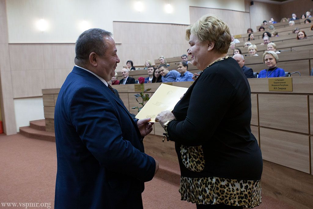 Торжественное собрание, посвященное 24-й годовщине образования законодательного органа республики, завершилось вручением Благодарственных писем Председателя Верховного Совета за активную трудовую деятельность и высокий профессионализм. В числе получивших их – парламентарии Ефимий Коваль, Андрей Сипченко, Владимир Боднар, Сергей Чебан, Председатель Счетной палаты Светлана Изместьева, депутаты прошлых созывов, сотрудники Аппарата Верховного Совета.