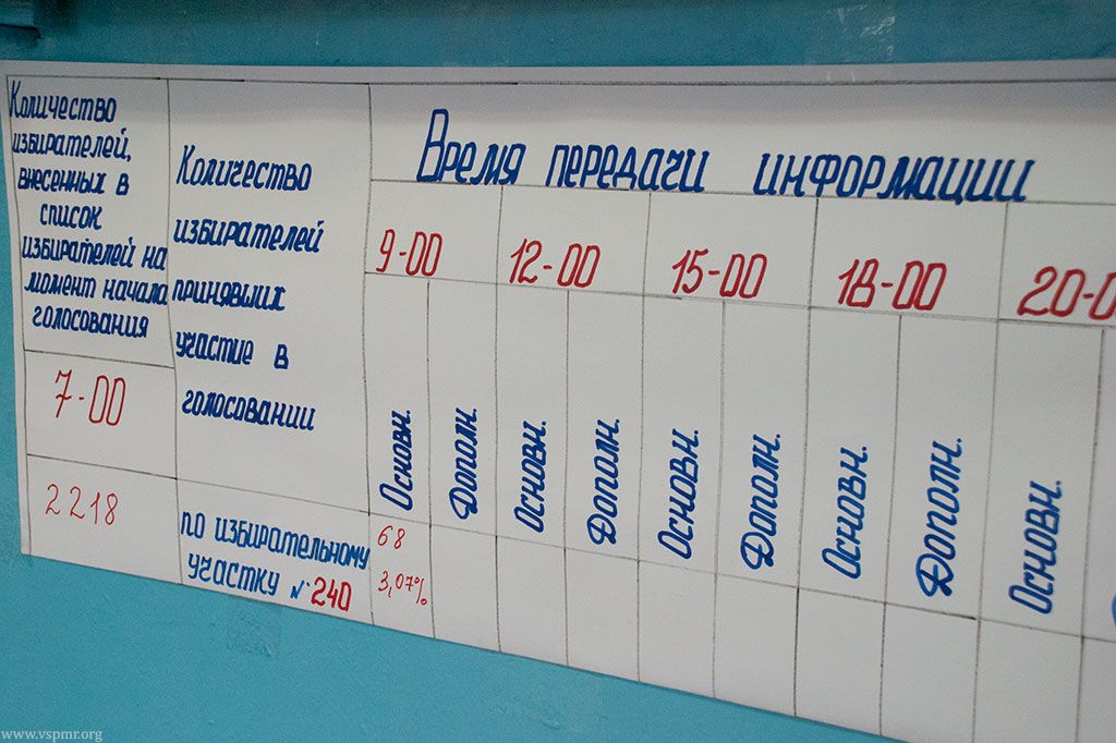 По состоянию на 9.00 на избирательном участке №240, который также открылся в 7.00, проголосовали 68 человек. «Активнее тираспольчане стали идти на выборы после 9 утра. Люди приходят с хорошим настроением. На данный момент уже проголосовало чуть более 3% от общего числа избирателей. Всего же в списке по нашему участку насчитывается 2218 человек », – говорит председатель УИК №240 Ольга Соколова.