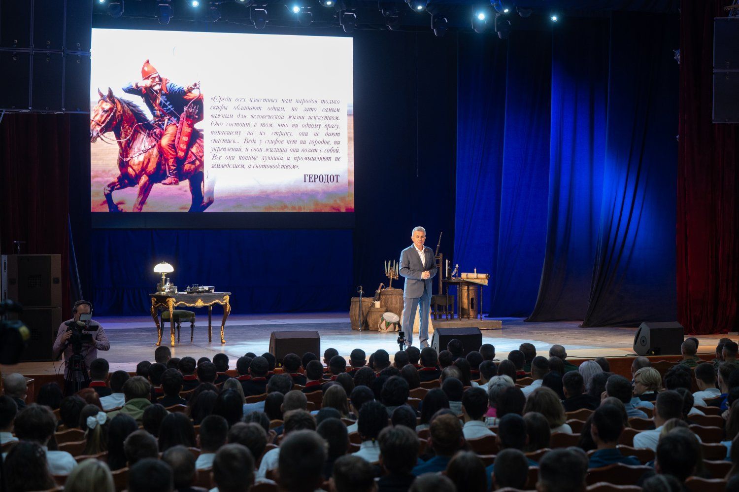 Озвученный руководителем страны материал ярко и информативно проиллюстрирован. Использованы фото- и видеодокументы, воссозданы с помощью современных технологий картины прошлого, сошедшие со страниц летописи приднестровского народа исторические личности ожили благодаря участию артистов.