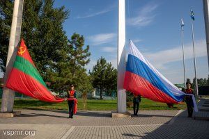 Сразу после торжественной церемонии возложения цветов на площади Суворова по звуки государственного гимна ПМР в небо над столицей по традиции взмыли государственные флаги ПМР и РФ.