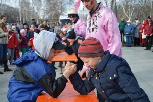 На празднике дети и подростки состязались в перетягивании каната и поедании блинов.