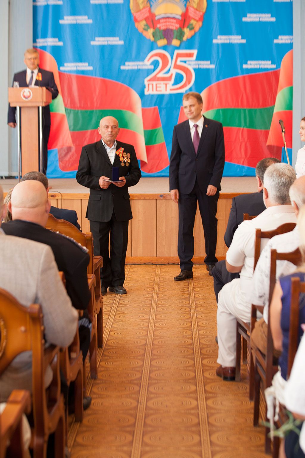 В канун 25-летия Приднестровье чествует своих героев. В малом зале Дворца Республики состоялось торжественное собрание, в рамках которого глава государства вручил награды достойнейшим приднестровцам. Участие в праздничном мероприятии приняли спикер парламента Михаил Бурла, Председатель правительства Татьяна Туранская, представители законодательной и исполнительной ветвей власти, защитники республики и члены их семей.