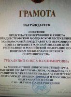 Полномочный представитель Верховного Совета ПМР в РФ по вопросам межпарламентского сотрудничества Ольга Гукаленко отмечает сегодня юбилей. В честь 65-летия, за многолетний добросовестный труд и особый вклад в развитие и укрепление межпарламентских связей между Приднестровьем и Россией Ольга Гукаленко награждена почетной грамотой ВС ПМР и знаком отличия «Заслуженный парламентарий ПМР».