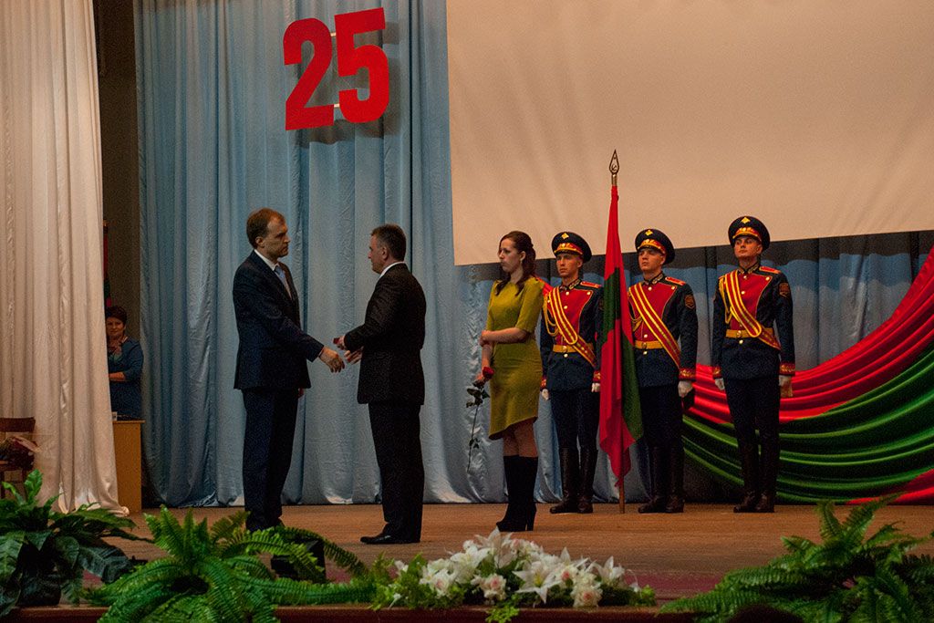 «Уважаемые коллеги, депутаты Верховного Совета всех созывов – от первого до нынешного, шестого. От всей души поздравляю вас с 25-летием Приднестровской Молдавской Республики и, естественно, с 25-летием Верховного Совета. Давайте поблагодарим приднестровцев за проявленное понимание и активность при выборе своего законодательного органа власти. Мудрые приднестровцы не поддались призывам отдельных провокаторов бойкотировать выборы в Верховный Совет, потому что понимают: законодательный орган страны является самым главным, самым важным атрибутом государства. Нет парламента – нет независимости, а значит, нет и государства. Обращаюсь к вам, друзья, в сложившейся непростой политической и экономической ситуации в мире. Не менее сложная ситуация и в нашем родном Приднестровье, а может, и более сложная. В этих условиях избиратели выдали вам мандат доверия и ждут от вас самоотверженной, упорной, созидательной и согласованной между собой и всеми ветвями власти работы. Прошу вас всегда помнить: только искреннее и уважительное отношение к каждому гражданину Приднестровья, к человеку-труженику и ветерану, отбросив личные амбиции и гордыню, в постоянных поисках находя согласие и компромисс между собой и остальными ветвями власти, даст вам моральное право быть лидерами общества, позволит вам вместе решить стоящие перед приднестровским обществом задачи. Успехов вам и удачи!»