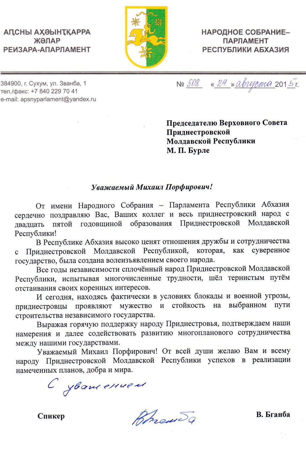 Поздравление Председателя Народного собрания Республики Абхазия В. Бганба депутатскому корпусу Приднестровья