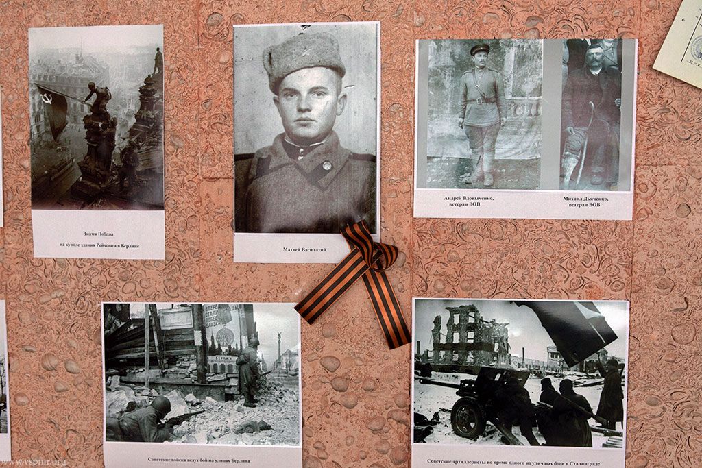 В фойе у входа в зал заседаний Верховного Совета размещена экспозиция, посвященная ветеранам Великой отечественной войны. С фотографий глядят те, кто выковал Великую Победу. Среди них – героические потомки приднестровских парламентариев. Материалы из семейных архивов - фото, документы, личные вещи ветеранов - предоставили для создания фото-выставки Илона Тюряева, Петр Пасат, Олег Василатий, Григорий Дьяченко. Экспозиция открыта для пополнения. Она будет действовать до окончания майских праздников.