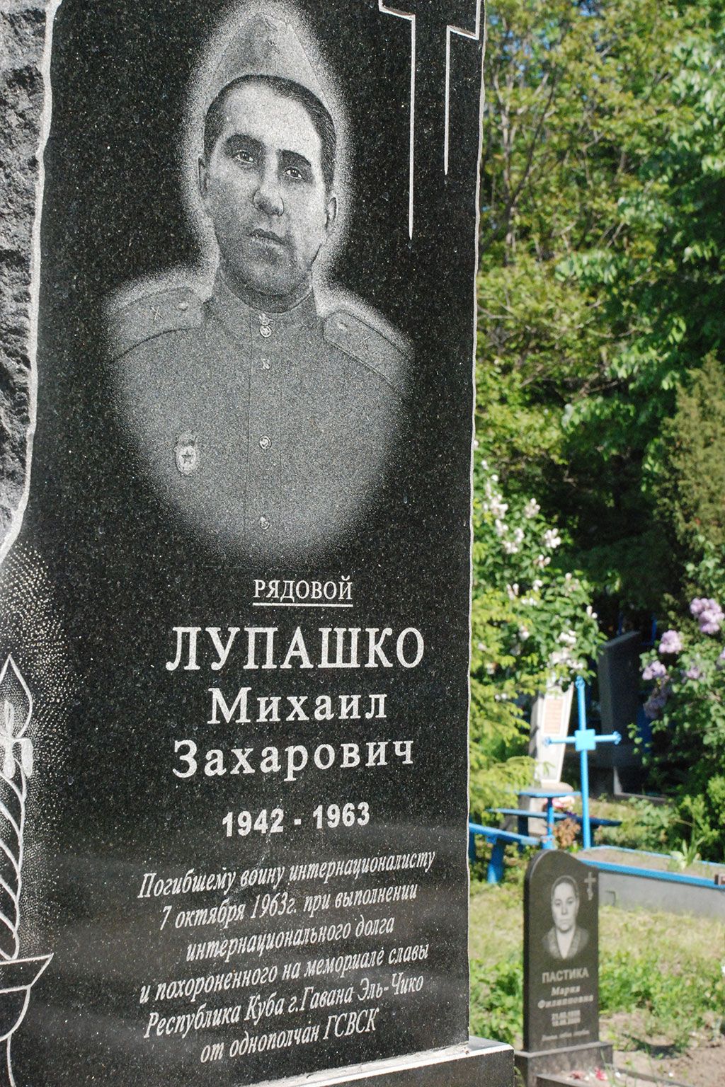 Куба начала 60-х годов прошлого столетия – одна из героических страниц советской истории, написанная не на родной земле, но кровью советских солдат. 43 тысячи человек и боевое вооружение, в том числе и атомное, были тайно переброшены для защиты кубинцев от американской агрессии. Среди участников секретной операции «Анадырь» были и уроженцы приднестровского края. Один из них – каменчанин Михаил Лупашко. На родину с острова, где пришлось проходить службу, он так и не вернулся: погиб 7 октября 1963 года при выполнении интернационального долга. Был похоронен в кубинском поселке Торренс. Но это место не стало последним пристанищем солдата. 15 лет спустя он и его погибшие товарищи были перезахоронены. Вечный покой они нашли под плитами Мемориального комплекса Эль-Чико, созданного на окраине Гаваны к 60-летию советских Вооруженных Сил.