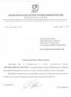 На днях в законодательный орган республики пришла ответная телеграмма от председателя партии «Справедливая Россия» Сергея Миронова. В ней, в частности, говорится: «Благодарю вас за поздравление по случаю прохождения партии «Справедливая Россия» в Государственную Думу седьмого созыва, а также за добрые слова в мой адрес. Пользуясь возможностью, желаю вам успехов в политической деятельности на благо граждан Приднестровской Молдавской Республики!»