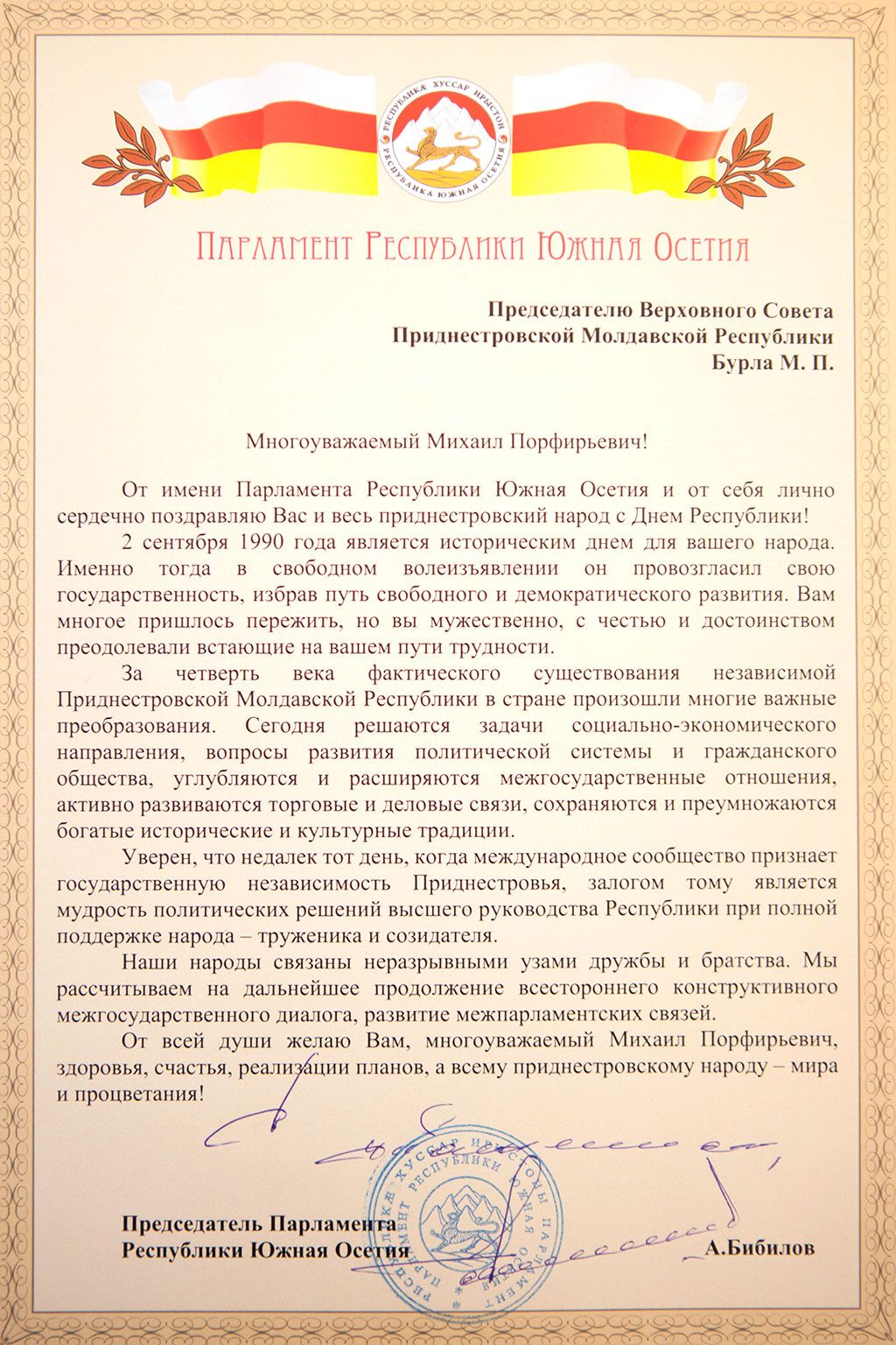 Спикер парламента Южной Осетии А.Бибилов поздравил Председателя Верховного Совета с юбилеем республики