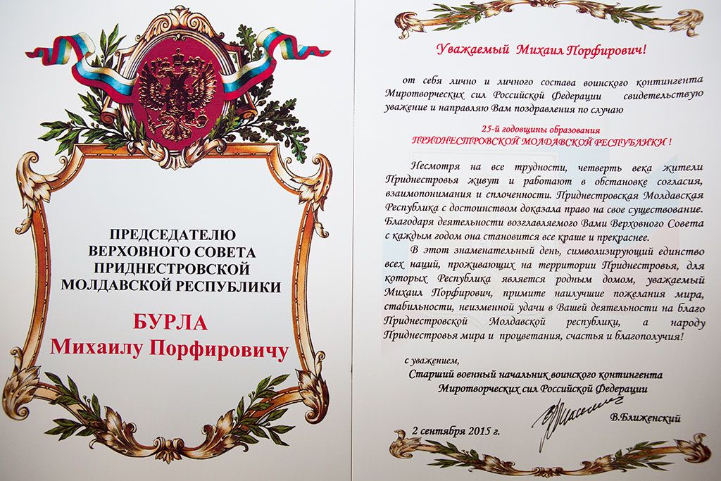 Старший военный начальник воинского контингента Миротворческих сил Российской Федерации В. Ближенский поздравил Михаила Бурлу с 25-ой годовщиной образования ПМР
