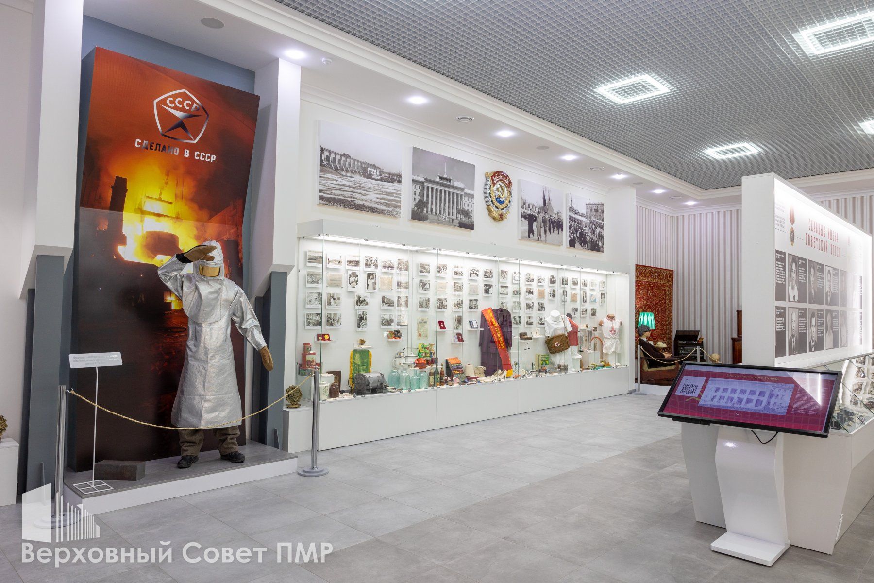Главный зал о приднестровской государственности представил старший научный сотрудник Историко-краеведческого музея Александр Булгаков. Он дал краткую историческую справку о становлении республики, рассказал о первых съездах депутатов всех уровней. В экспозиции представлены один из первых флагов республики, инсталляция, посвященная защитникам ПМР, главные военные и государственные награды, карта с гербами всех городов. Есть стенды, посвященные промышленности, органам власти, в том числе, законодательной, и даже экспонаты футбольного клуба «Шериф», одержавшего историческую победу над мадридским «Реалом» в сентябре 2021 года.