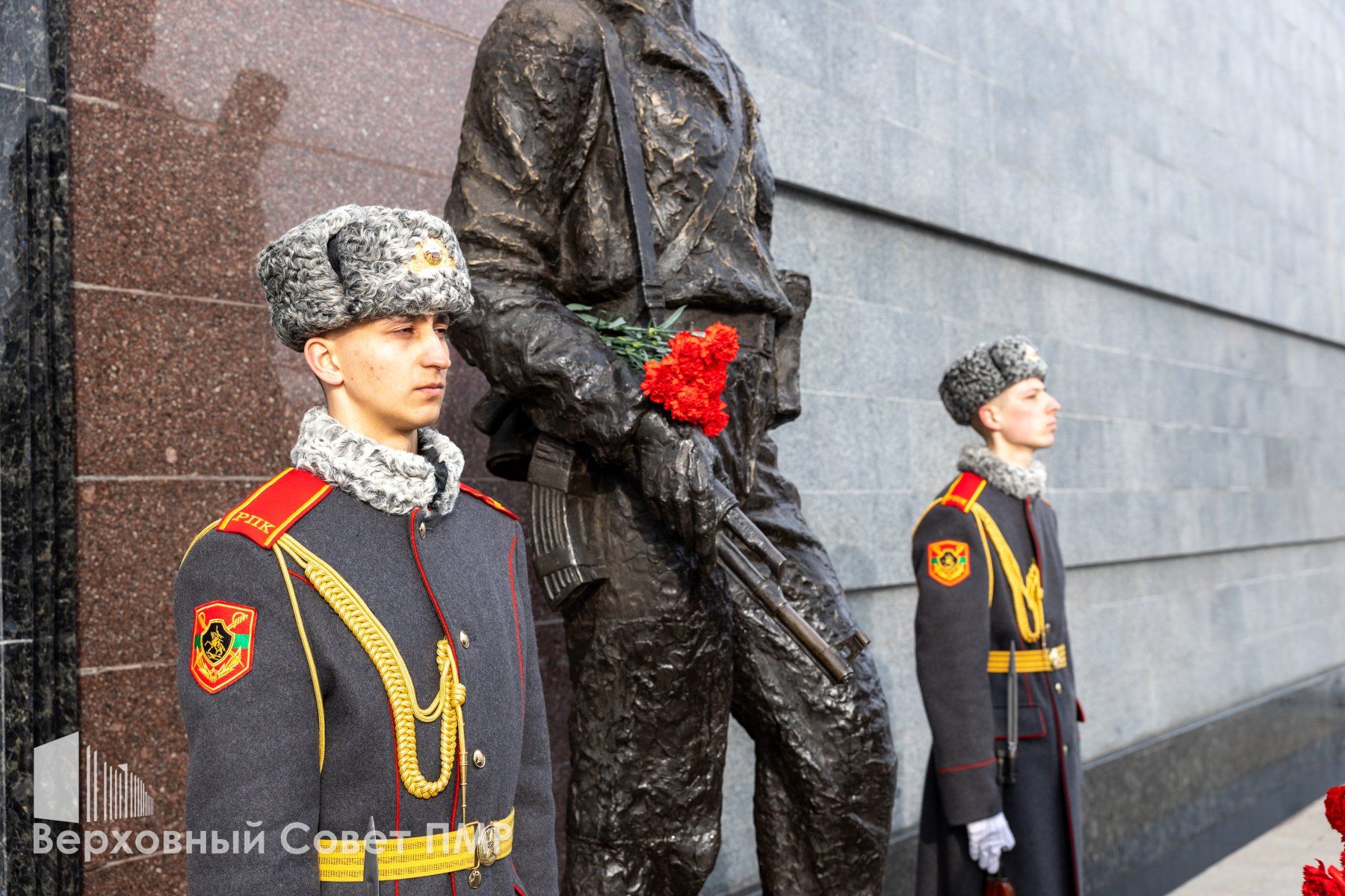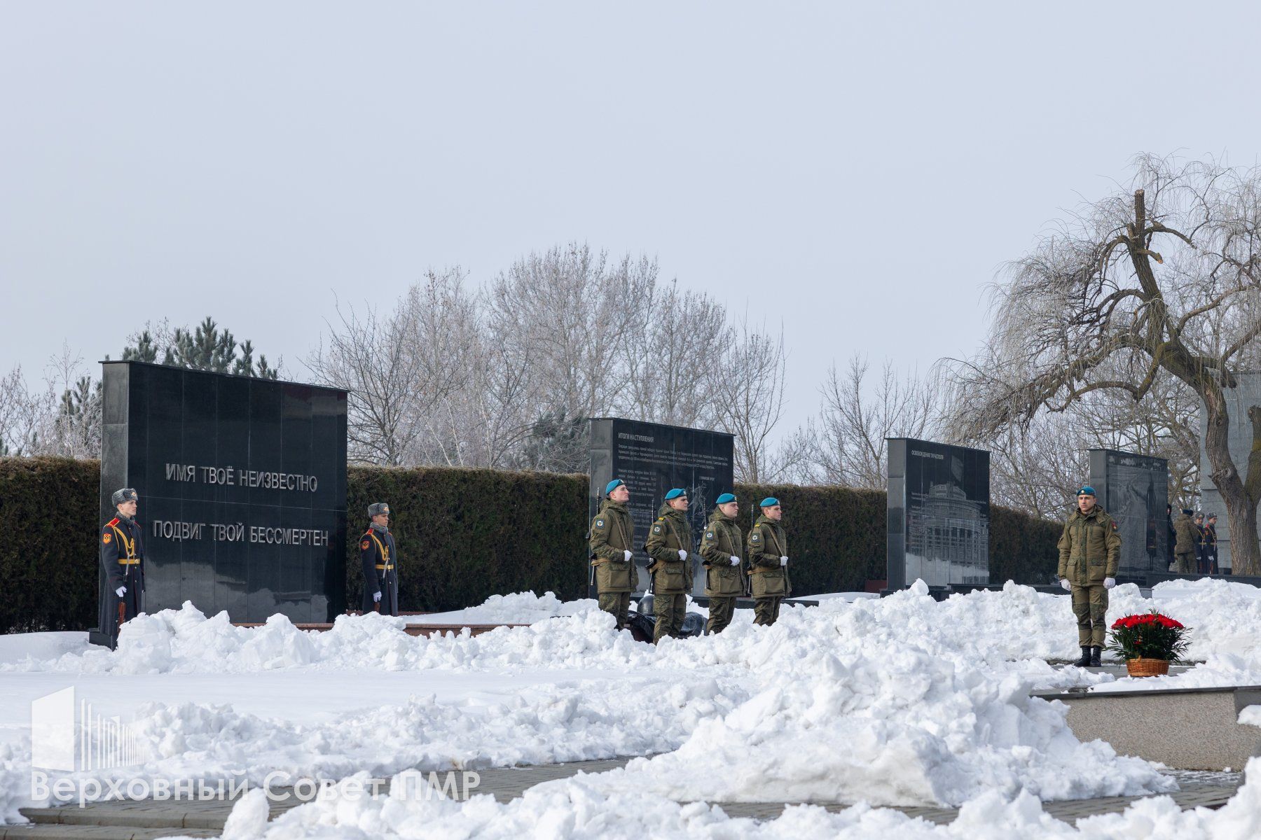 Память павших защитников Отечества собравшиеся почтили минутой молчания, после чего к Вечному огню легли живые цветы. Россыпи красных гвоздик покрыли и гранитные плиты в память о защитниках разных эпох. Тех, кто сражался на фронтах Великой Отечественной войны, воинах-интернационалистах, исполнивших свой долг за пределами Родины, и защитниках Приднестровья, отстоявших родную землю в 1990-1992 годах.