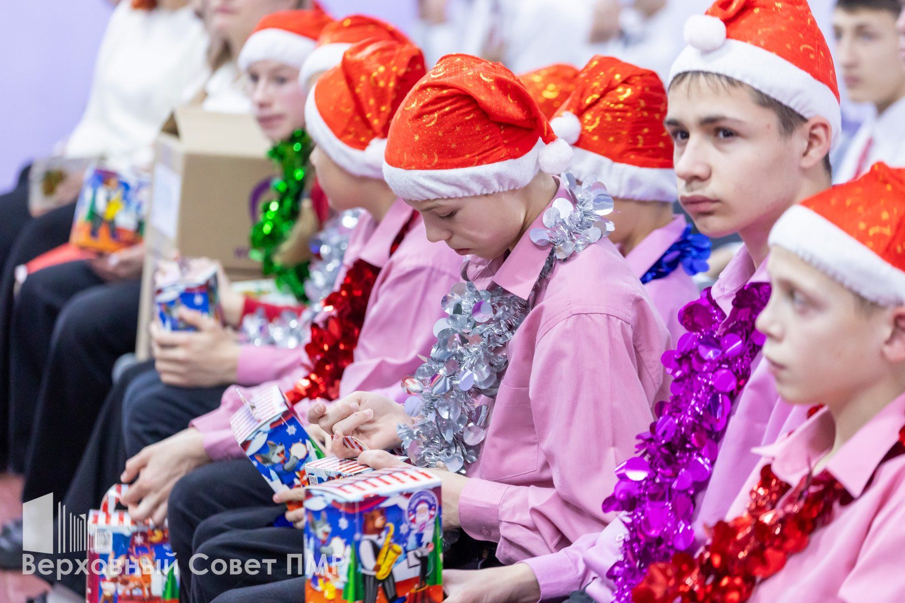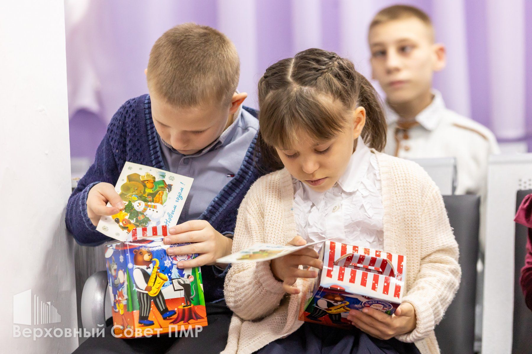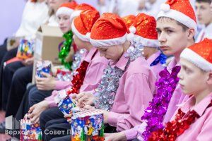 Спикер парламента пожелала детям верить в волшебство и вместе с помощниками вручила каждому сладкий новогодний подарок.