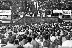 24 апреля 1989 года многотысячный митинг прошел в Рыбнице. Горожане выступали за равноправие языков, придание статуса государственного молдавскому и русскому и за проведение референдума против перехода на латинскую графику.