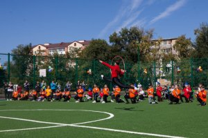 На открытии стадиона учащиеся спортивных секций города и школьники продемонстрировали спортивные навыки. Руководители республики оставили автографы на футбольном мяче. Он будет храниться в музее школы №18.