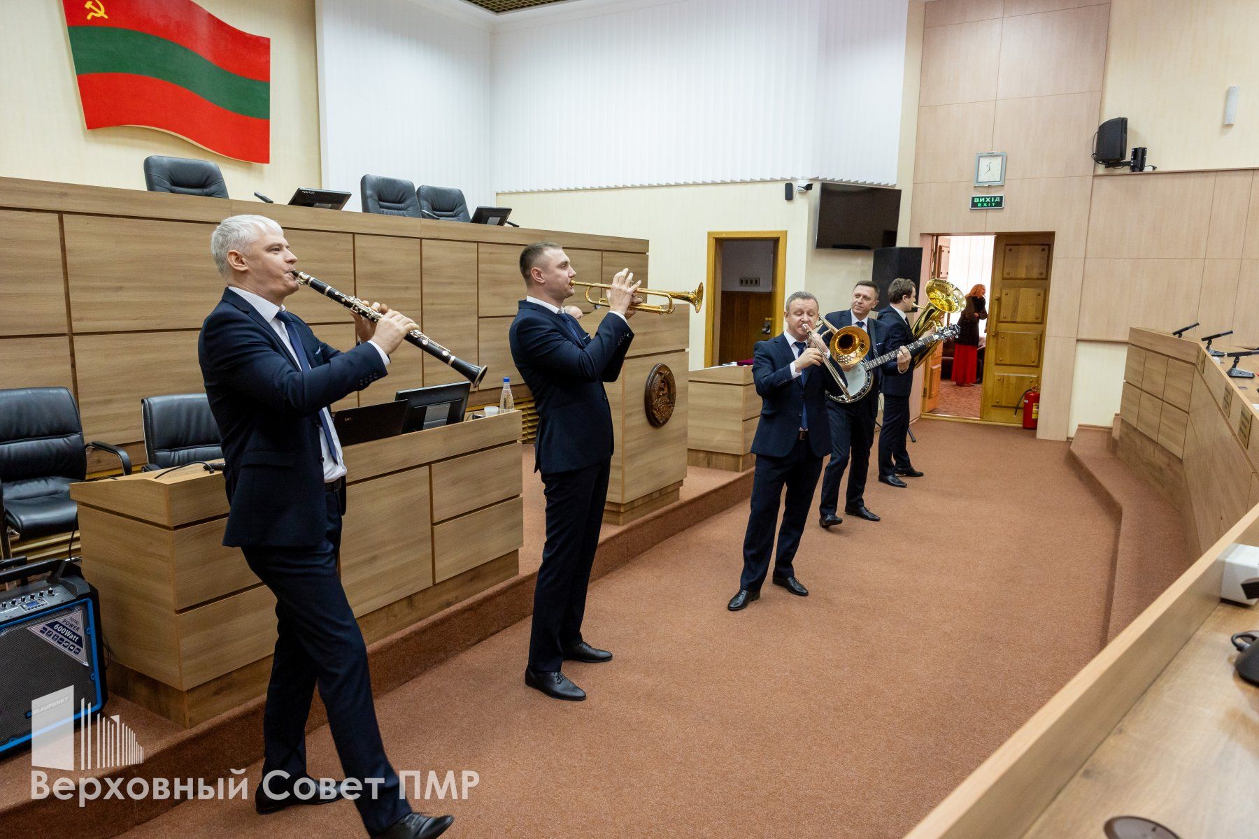 Особую атмосферу на торжественном мероприятии создали артисты оркестра Министерства обороны ПМР и музыканты Государственного коллектива «Либерти». Они подарили руководителям и специалистам Верховного Совета свое мастерство и хорошее настроение.