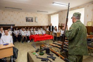 Пистолет Макарова, парабеллум, ППШ, тротиловые шашки и противотанковые с противопехотными гранатами. Все эти экспонаты безопасны и давно могут стать музейными экспонатами. Но на этом уроке все необычно. Поэтому после вступительных слов мальчишки и девчонки подходят к оружию. Его можно взять в руки, обязательно сфотографироваться, задать вопросы и поделиться впечатлениями.