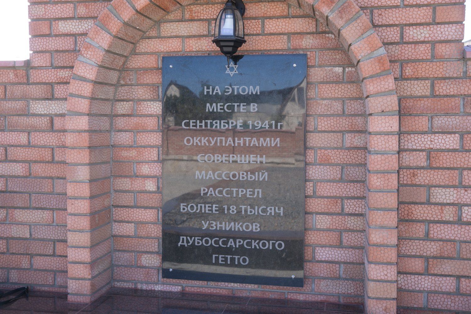 В период оккупации в 1941 году в Дубоссарах, где почти половину населения составляли евреи, нацисты создали два крупных гетто. Одно из них занимало улицы 25 Октября и Кирова, где до войны компактно проживало еврейское население. Сюда же согнали евреев из окрестных сел. Второй лагерь организовали на местном табачном ферментационном заводе, куда под охраной румынских жандармов конвоировали евреев из Кишинева, Григориополя, Тирасполя, Котовска, Балты, Ананьева, Красных Окон. На восточной окраине Дубоссар было выкопано 11 огромных ям глубиной 4 метра. Утром 12 сентября 1941 года начались массовые расстрелы, продолжавшиеся до 28 сентября. Убивали мужчин, женщин, детей, стариков. Расстреливали группами по 20-30 человек. При эксгумации останков в одной из 11 расстрельных ям насчитали порядка полутора тысяч тел. Списков жертв не было.
