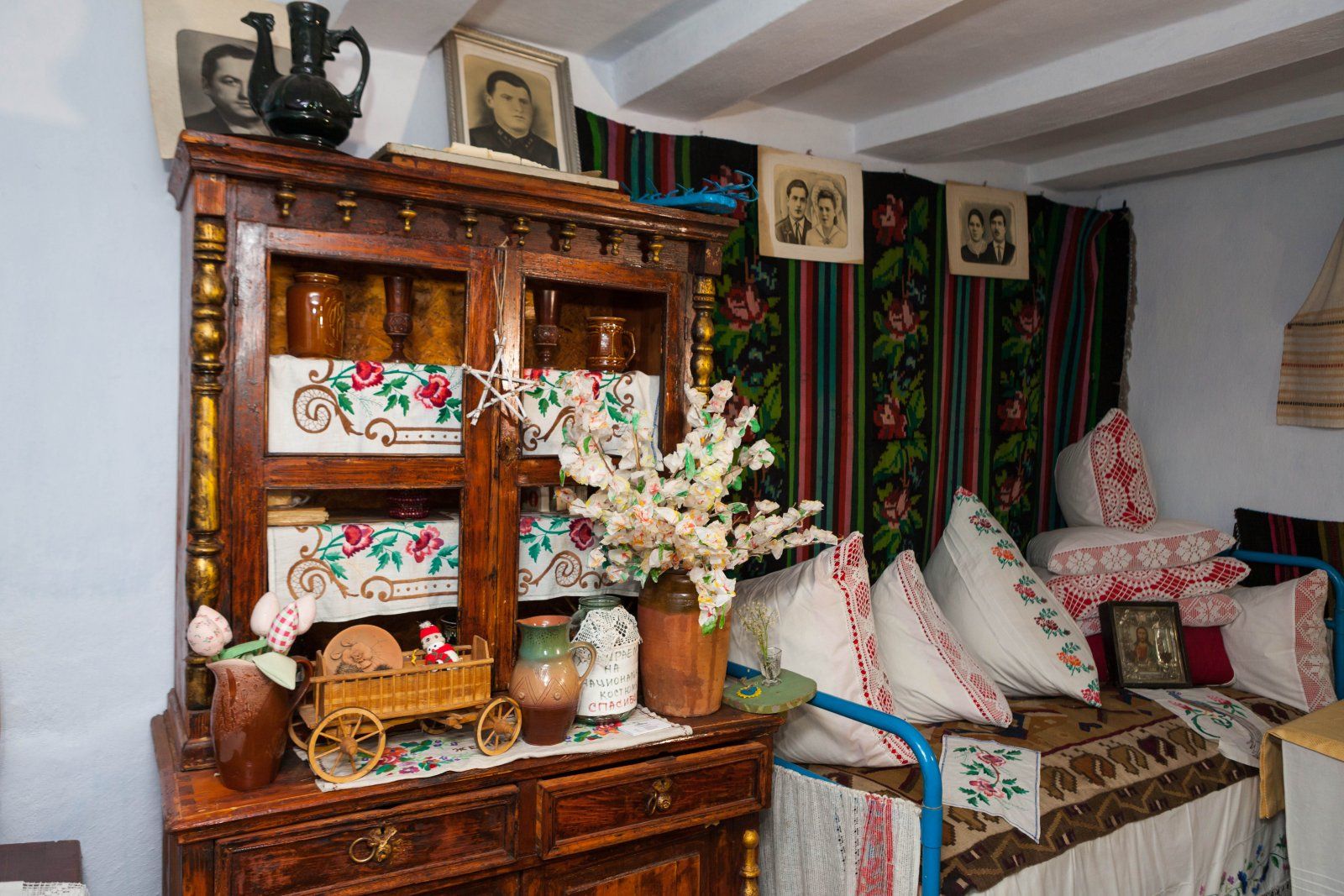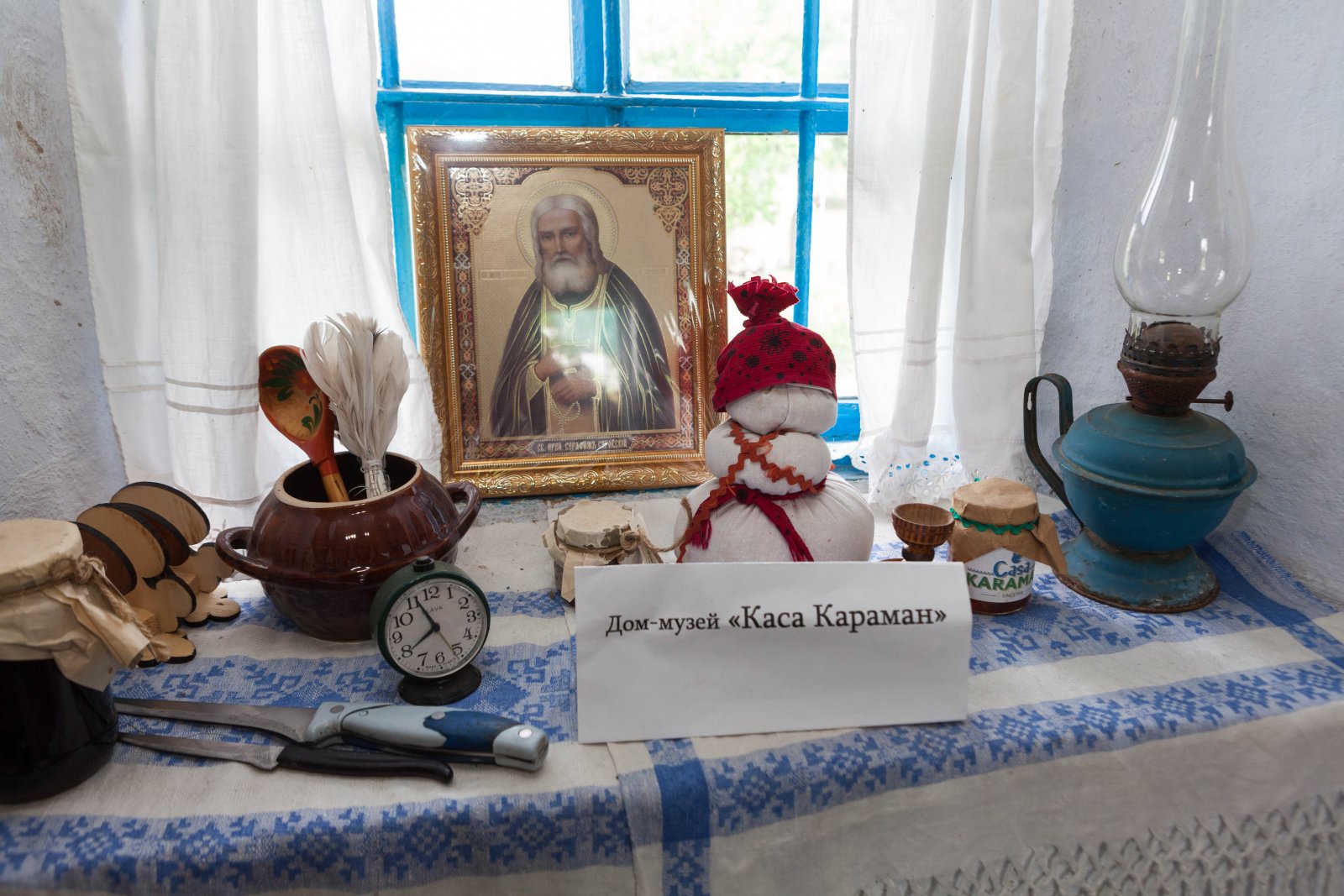 Глиняный домик с деревянными ставнями в тенистом дворе – словно ожившая сказка. Внутри – традиционная молдавская утварь: печка, глиняная посуда, старинные фотографии, пряжа ручной работы. Что-то досталось от родителей, чем-то поделились неравнодушные соседи. Парадная комната «каса маре» всегда готова к празднику. У стены расположена расписная лавка, старожил дома. Ее собирали в комнате, когда дом строился, и никуда больше не выносили. Еще одна гордость – домотканый ковер, которому почти 120 лет. Традиционные технологии его создания занесены в список объектов всемирного наследия ЮНЕСКО.
