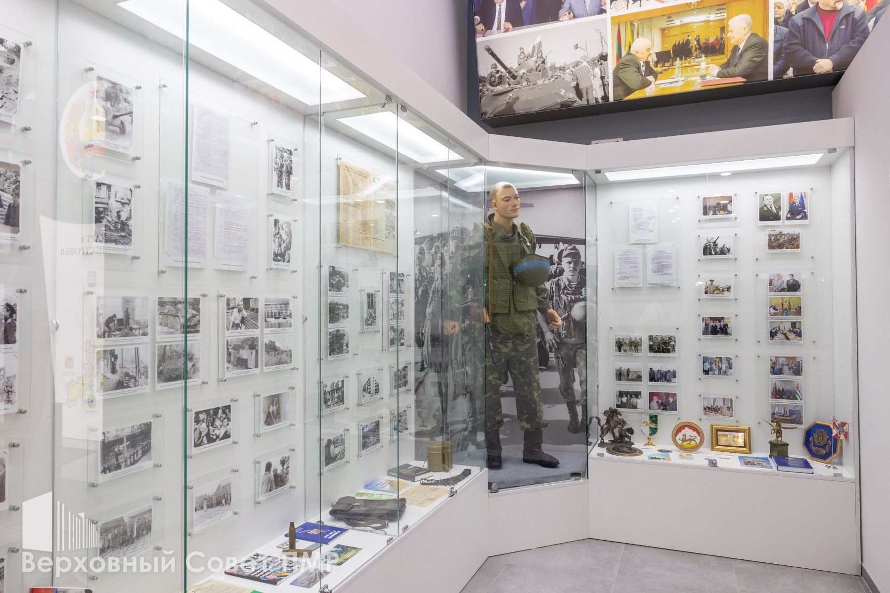 Главный зал о приднестровской государственности представил старший научный сотрудник Историко-краеведческого музея Александр Булгаков. Он дал краткую историческую справку о становлении республики, рассказал о первых съездах депутатов всех уровней. В экспозиции представлены один из первых флагов республики, инсталляция, посвященная защитникам ПМР, главные военные и государственные награды, карта с гербами всех городов. Есть стенды, посвященные промышленности, органам власти, в том числе, законодательной, и даже экспонаты футбольного клуба «Шериф», одержавшего историческую победу над мадридским «Реалом» в сентябре 2021 года.