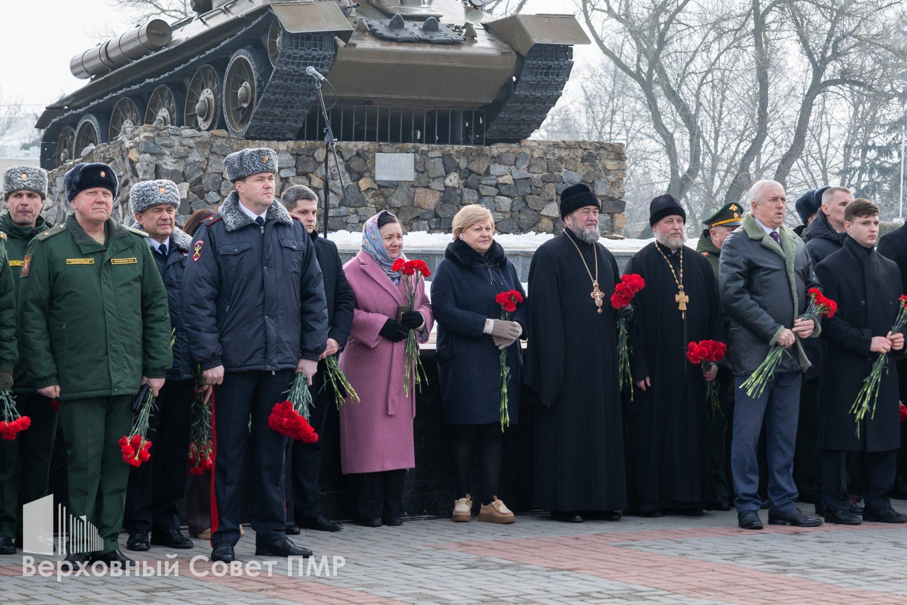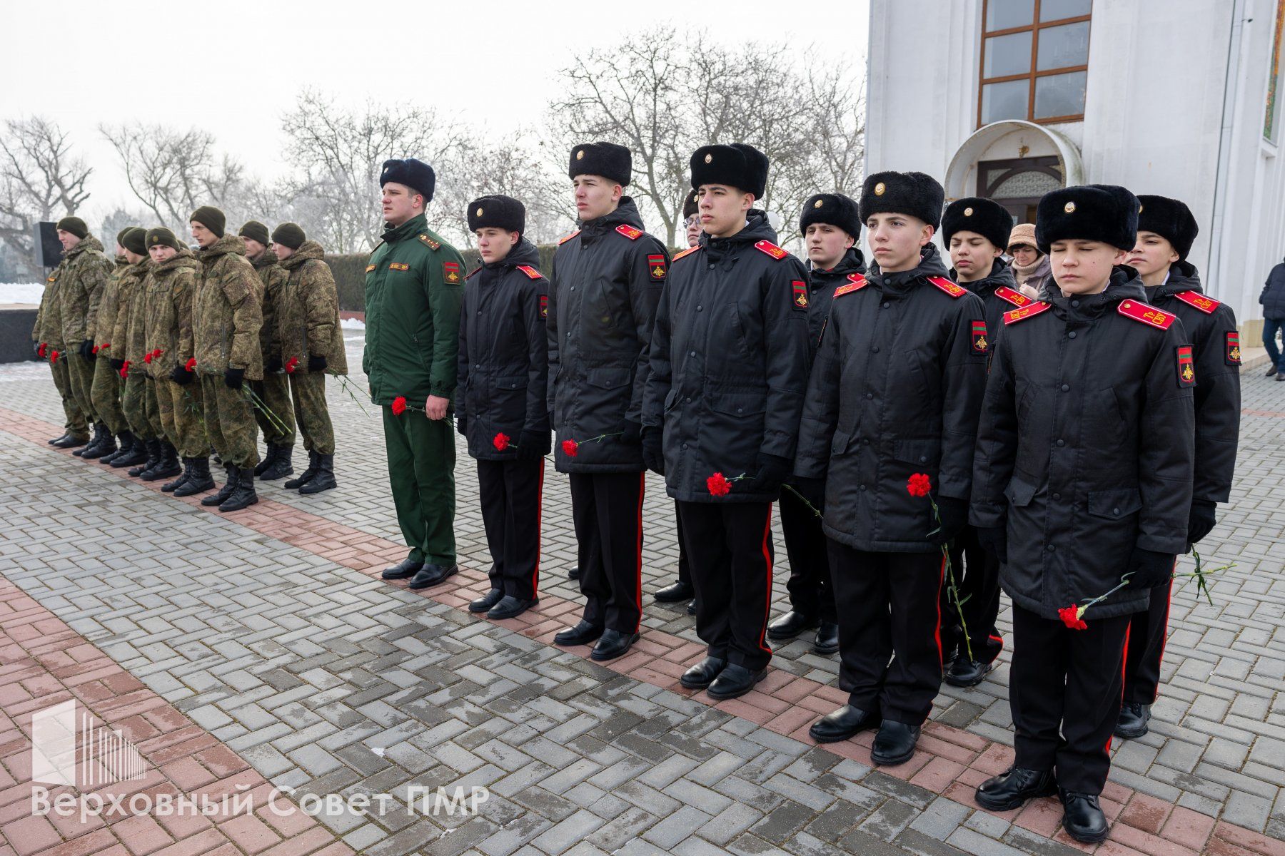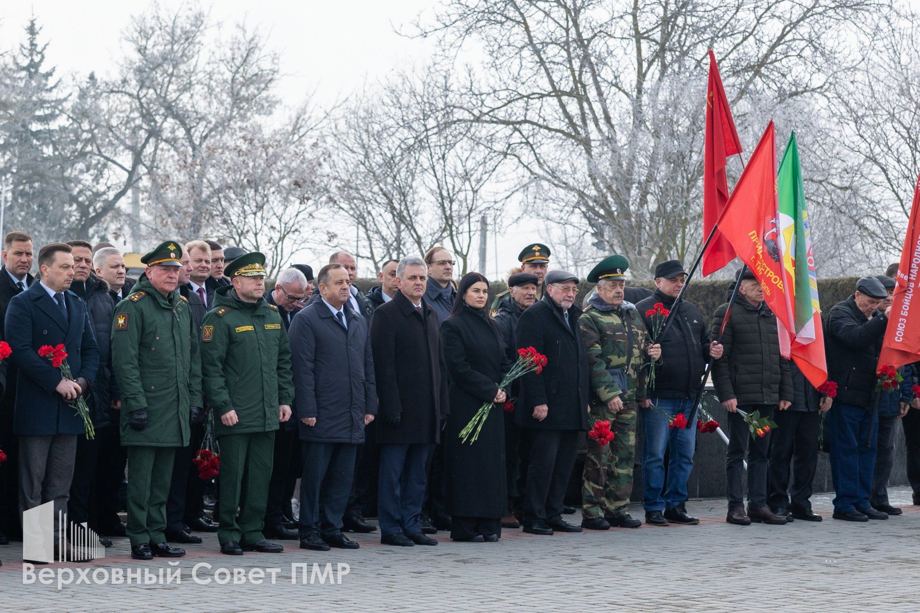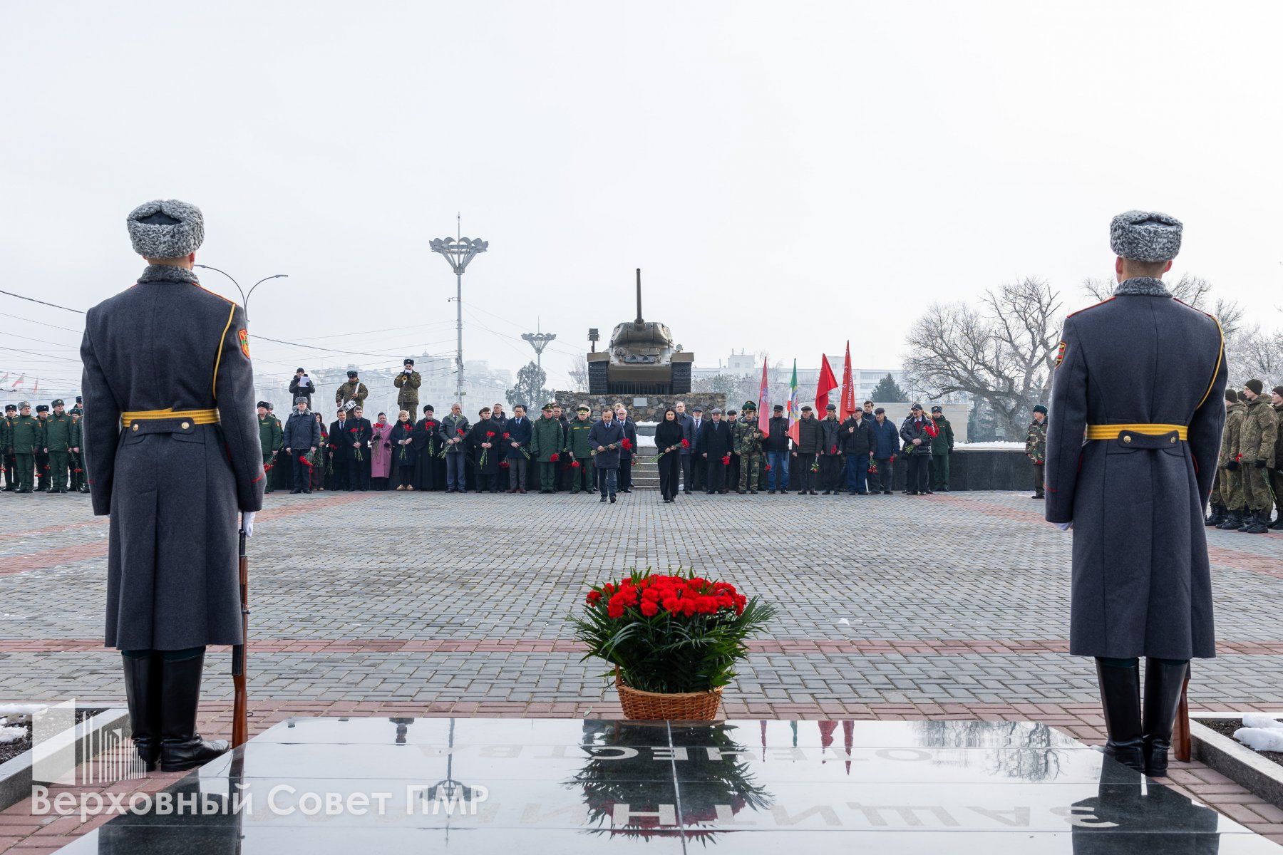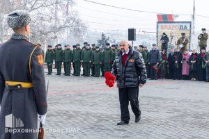 Память павших защитников Отечества собравшиеся почтили минутой молчания, после чего к Вечному огню легли живые цветы. Россыпи красных гвоздик покрыли и гранитные плиты в память о защитниках разных эпох. Тех, кто сражался на фронтах Великой Отечественной войны, воинах-интернационалистах, исполнивших свой долг за пределами Родины, и защитниках Приднестровья, отстоявших родную землю в 1990-1992 годах.