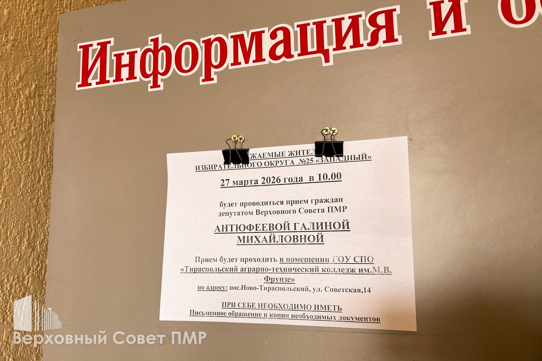 Прием граждан на округе №25 «Западный» вице-спикер парламента, депутат по округу Галина Антюфеева проводит в четвертую пятницу месяца. Принимает тираспольчан в аграрно-техническом колледже им. М.В. Фрунзе поселка Новотираспольского, входящего в округ №25.