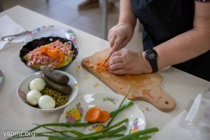 Хозяйки соревновались в нарезке салатов. Битва кулинаров развернулась не на шутку. Сначала конкурсантки тянули жребий. Он и определил, кто какой салат будет готовить. Выбирали из привычных и всеми любимых винегрета, оливье и крабового салата.